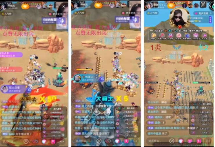 观众输入【炎】【1】或【水】【2】后会自动生成一个基础军队,通过点赞、评论、礼物进行战前军队部署。可以通过【进攻】【撤退】进行部队的控制,通过实时的操作,极限消耗对方阵营的兵力。游戏正上方为攻守方识别,游戏开始时,系统随机分配炎国、水国为进攻防守方。在规定时间内,进攻方未攻下防守方,则攻守方进行转换;若攻守方转换后,攻方未进攻下守方,则守方获得胜利。